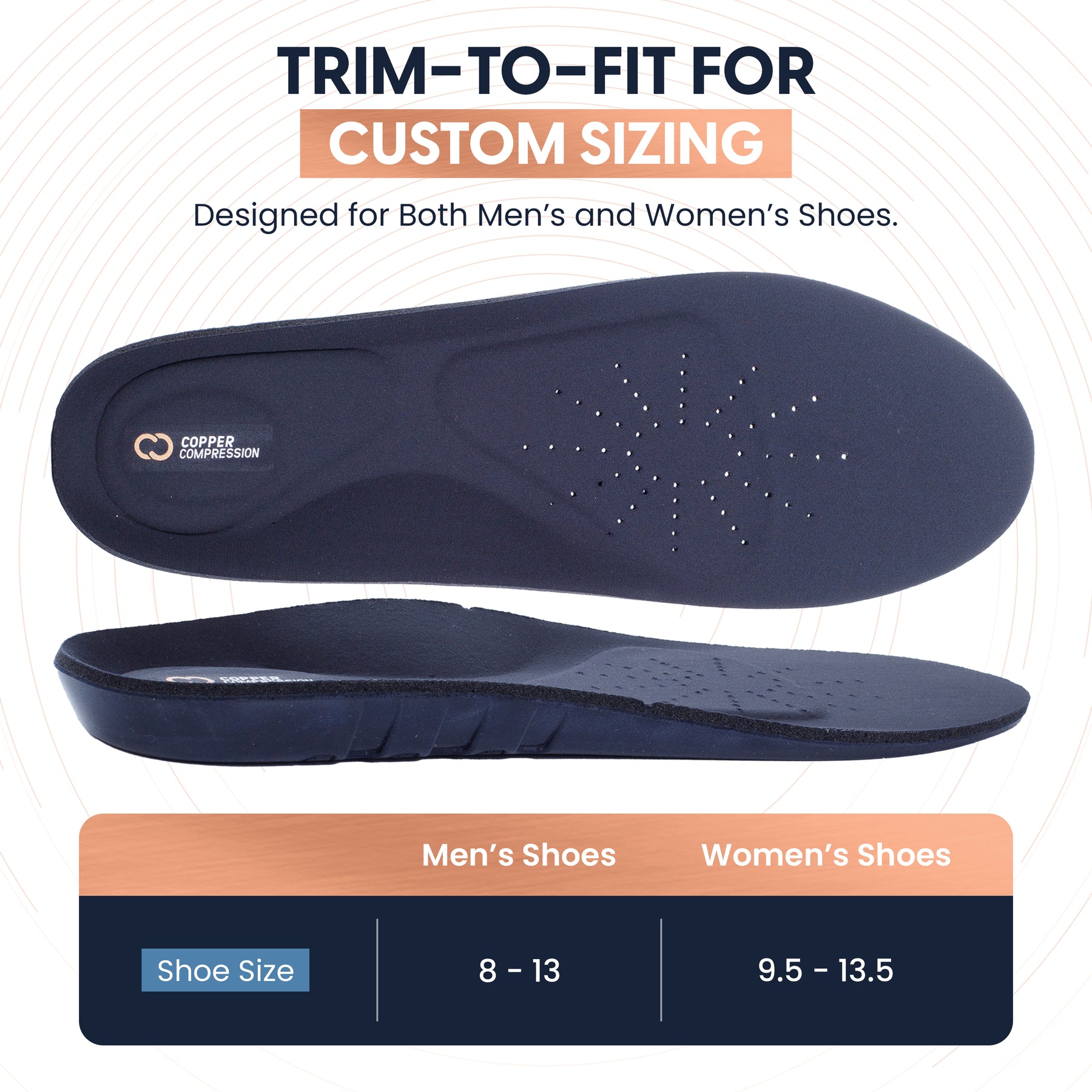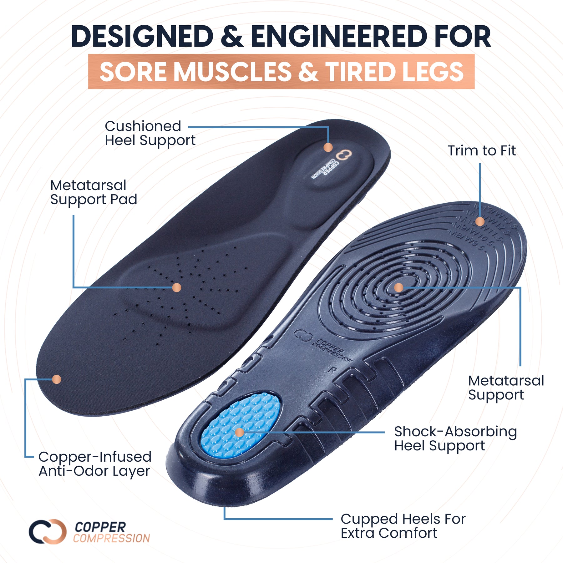 Copper Compression Work All Day Comfort Insoles are made for long days on your feet. This orthopedic style, full length footbed combines responsive cushioning with structured support to help you stay comfortable through shifts, errands, and active days.